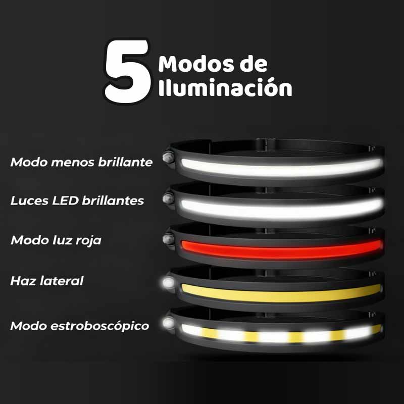 Con nuestra linterna frontal LED de visión panorámica 230º verás todo tu entorno de un solo vistazo. Perfecta para trabajar, hacer deporte o explorar sin preocuparte por sostener nada en tus manos.